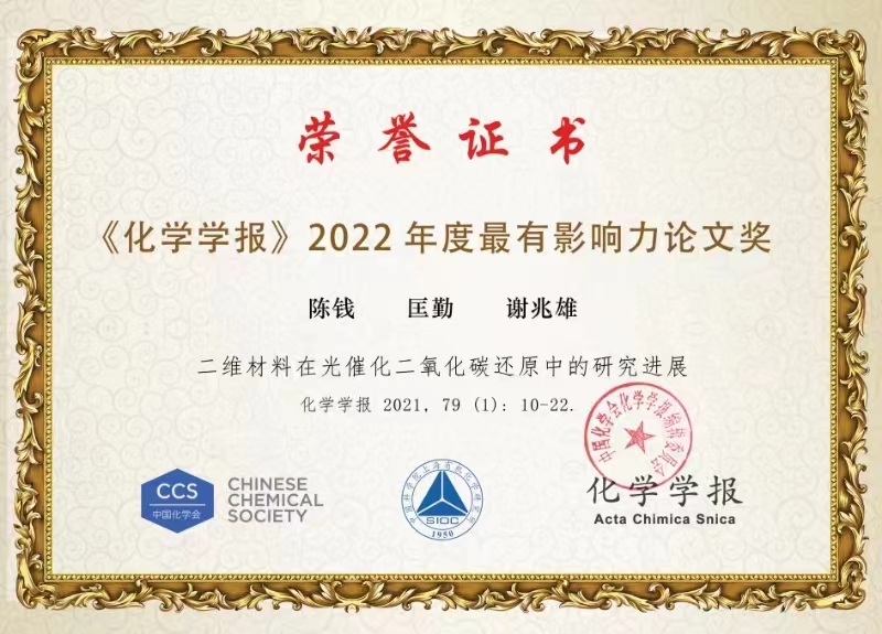 为推动促进国内外化学期刊发展、加强化学工作者交流,根据《化学学报》编委会决议,设立“《化学学报》XX年度最有影响力论文奖”。该奖对获奖人的国籍、居住地、单位、年龄等没有任何限制,由《化学学报》编委会根据文章年度SCI 引用情况评出(参考影响因子计算规则,兼顾当年发表当年引用情况,按第n-2年至第n年发表的文章在第n年引用情况排序),奖励通信作者荣誉证书、文章第一作者荣誉证书和奖金1000元。奖励10篇左右。我院谢兆雄教授、匡勤教授获奖。